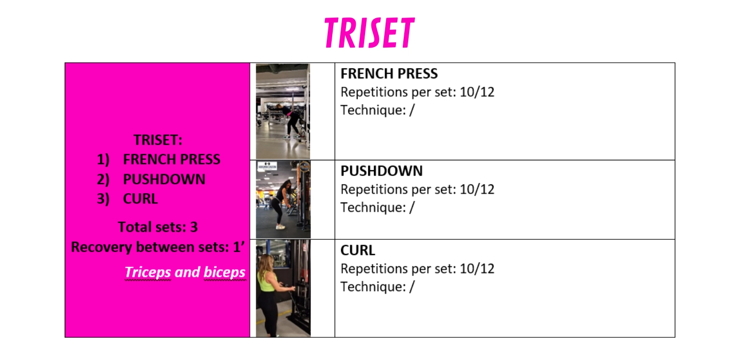TRISET: stesso principio di esecuzione del SS e del CS ma non hai solo 2 esercizi da svolgere uno dopo l’altro, ma 3 esercizi. Non c’è recupero tra di essi. Il recupero è da fare solo alla fine del terzo esercizio.