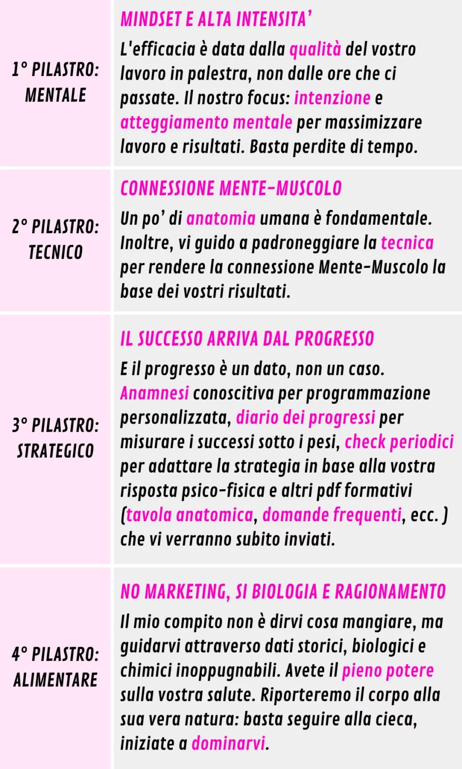 - Scheda di allenamento personalizzata per voi (ogni esercizio presente in scheda è collegato direttamente alla mia video esecuzione e descrizione della corretta tecnica)