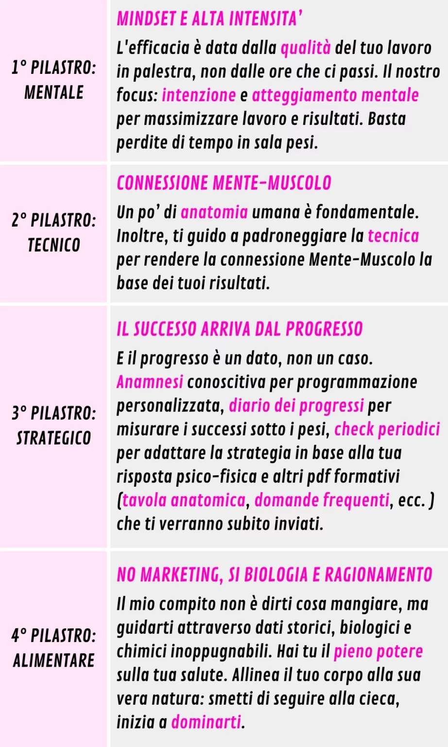 - Scheda di allenamento personalizzata (ogni esercizio presente in scheda è collegato direttamente alla mia video esecuzione e descrizione della corretta tecnica)